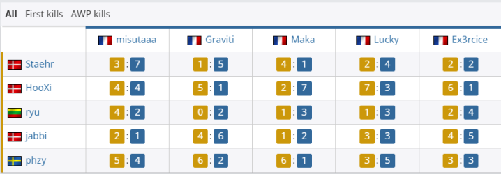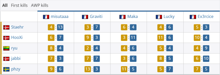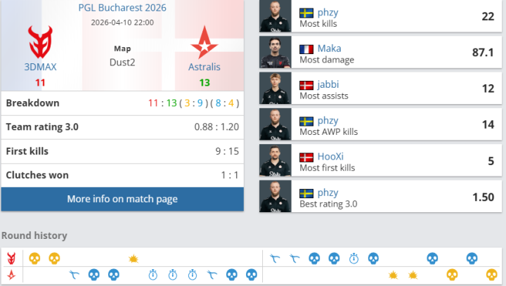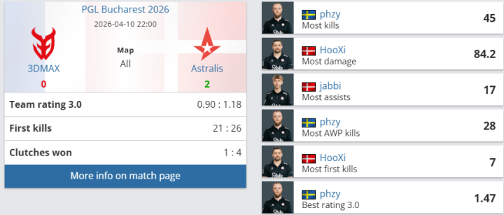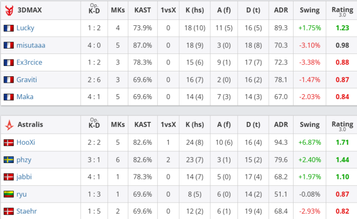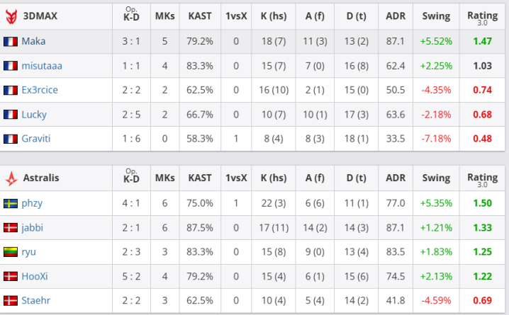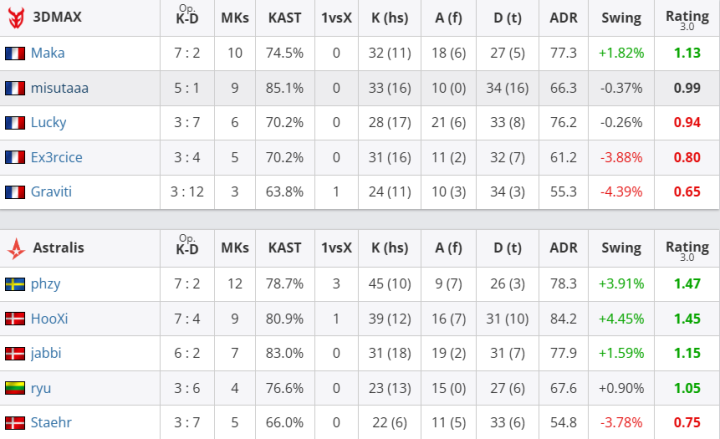 团队数据方面,Astralis团队rating为1.20,优于3DMAX的0.88;首杀数以15-9大幅领先,残局双方各赢一次(1-1)。个人表现上,Astralis方面,phzy砍下22杀、77.0ADR,以1.50rating成为全场最佳;jabbi贡献17杀14助攻,rating1.33;ryu和HooXi也分别有15杀入账;3DMAX的Maka砍下18杀、11次助攻、87.1ADR,以1.47rating领跑全队;misutaaa贡献15杀,rating1.03。但全队关键比分失利最终丢掉自选图。此役过后,Astralis在BO3中先下一城。
