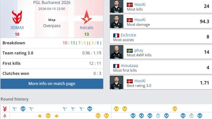 团队数据方面,Astralis团队rating为1.19,优于3DMAX的0.96;首杀数以11-12稍占劣势,残局以3-0完胜对手。个人表现上,Astralis的HooXi砍下24杀、10助攻、94.3ADR,以1.71rating领跑全场;phzy贡献23杀、14次AWP击杀,rating1.44;jabbi也有14杀入账。3DMAX方面,Lucky空砍18杀11助攻,rating1.23;misutaaa和Ex3rcice分别有18杀和15杀,但全队未能赢下任何残局,关键时刻屡屡失手。随着拿下自选图,A队挺进布加勒斯特决赛舞台。