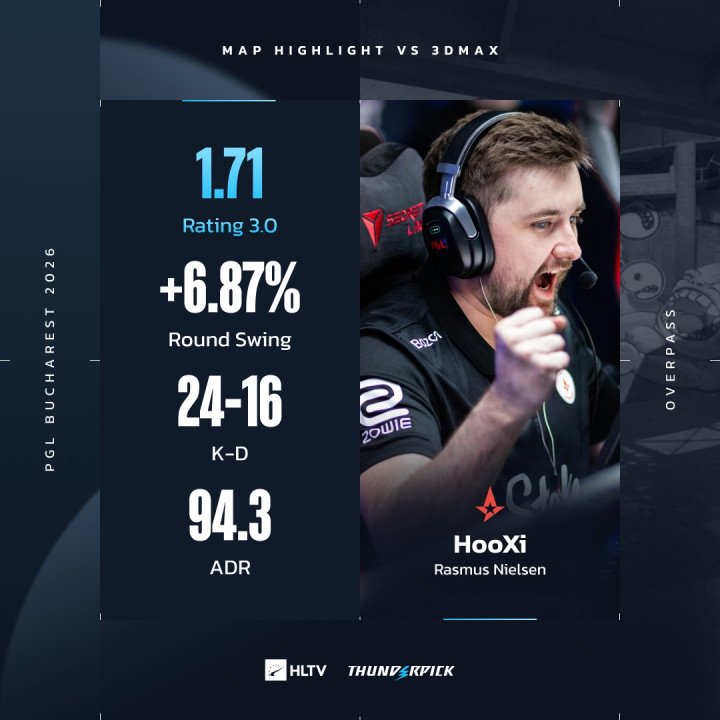 3DMAX与Astralis在图二Overpass上展开较量。Astralis以13-10战胜对手,直落两图挺进决赛。上半场Astralis作为进攻方与3DMAX打得难解难分;下半场换边后,Astralis凭借HooXi的灵性指挥以及神准枪法稳住局面,最终以13-10锁定胜局。