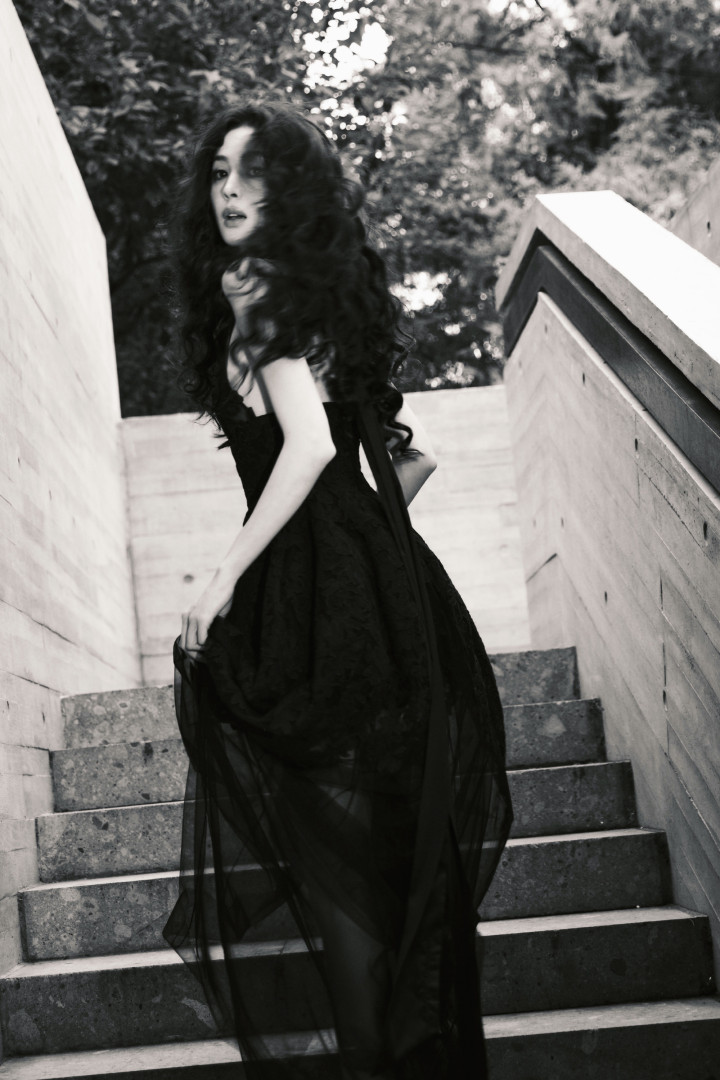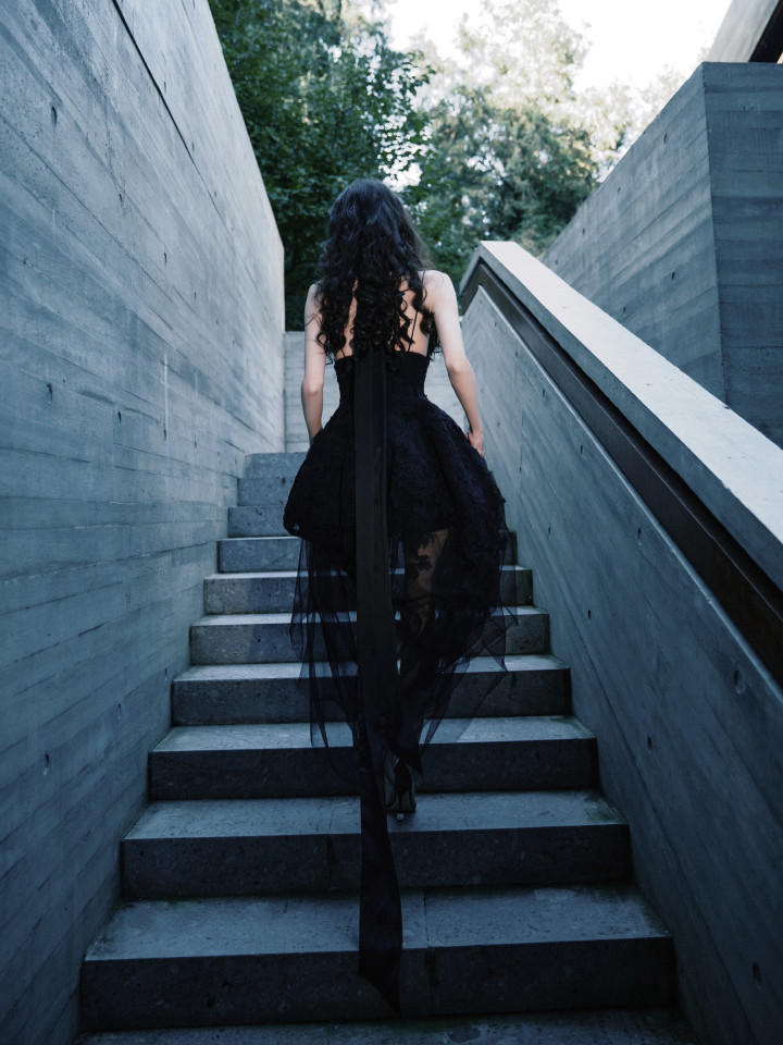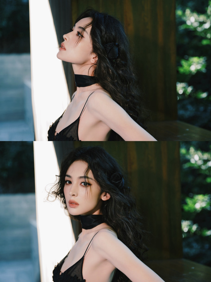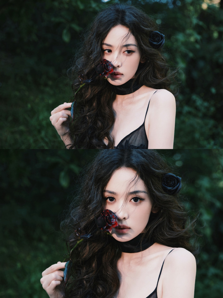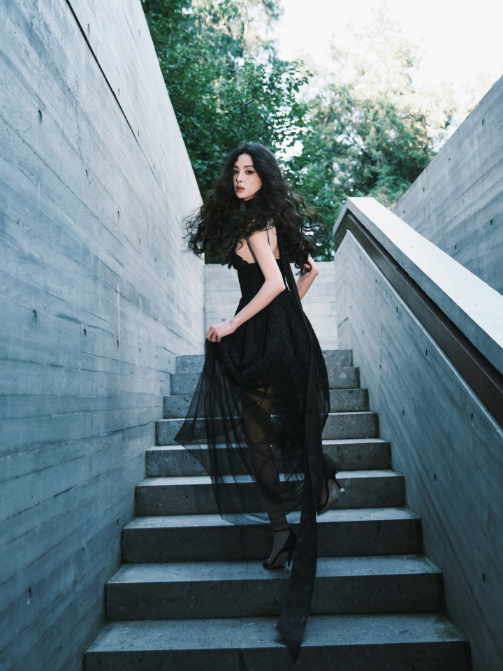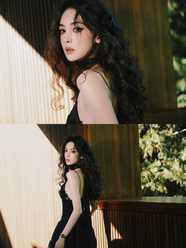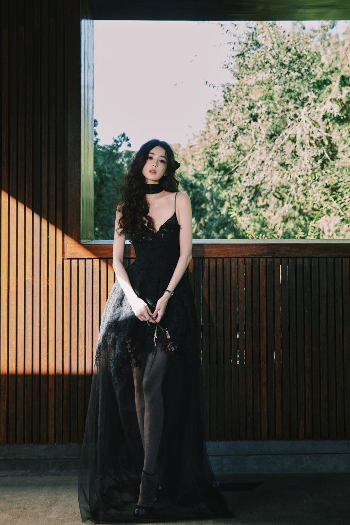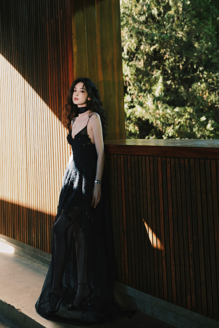 裙身的蕾丝花卉刺绣像暗夜里悄然盛放的花,薄纱裙摆又带着朦胧轻透感,柔媚与冷冽的气质居然能融合得如此丝滑。耳侧点缀的黑色玫瑰发饰更是点睛之笔,把“暗夜玫瑰”的主题诠释得恰到好处。
