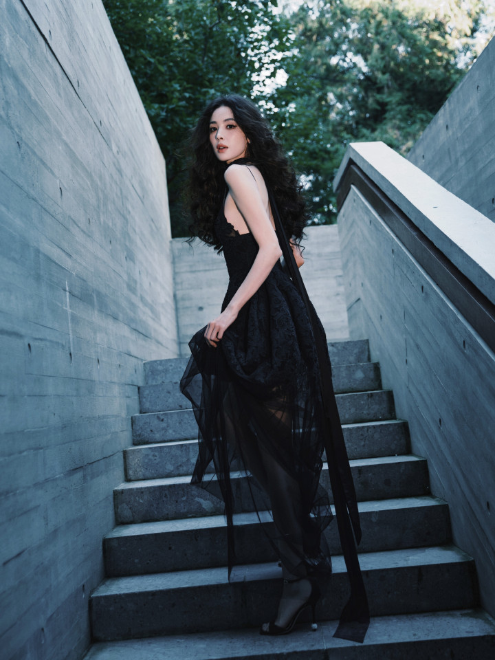 栩栩华生时尚文化大赏现场,古力娜扎身着Ermanno Scervino 2025秋冬高级定制系列黑色吊带蕾丝纱裙,把“性感与神秘”玩明白了——深V剪裁顺着肩颈线条自然延展,透视薄纱似薄雾般轻覆身型,腰臀曲线被勾勒得又精致又灵动。