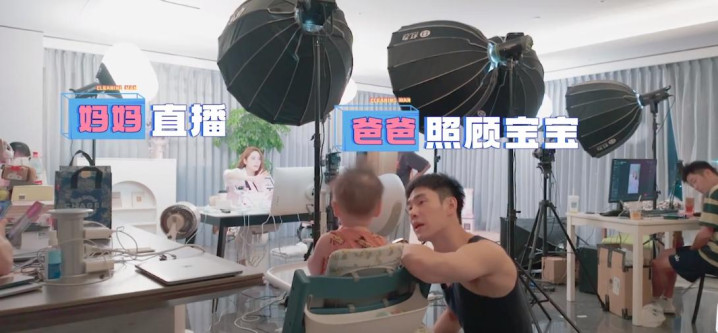 而他负责晚上哄睡,还在妻子直播的时候,在一旁陪娃。