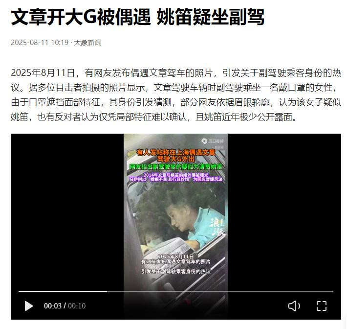 早前有网友拍到文章开着奔驰大G出行,副驾坐着一位戴口罩的女子,眉眼轮廓和姚笛十分相似。